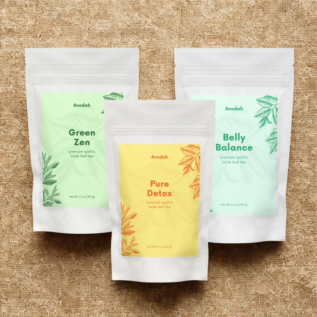 Begin with Pure Detox Tea, a powerful blend of green tea, turmeric, and ginger to promote natural detoxification and reduce inflammation. Soothe your center with Belly Balance Tea, a comforting mix of rooibos, peppermint, and cacao crafted to support digestive health and ease bloating. Complete your ritual with Green Zen Tea, made with ceremonial matcha to boost focus, calm the mind, and uplift your energy.